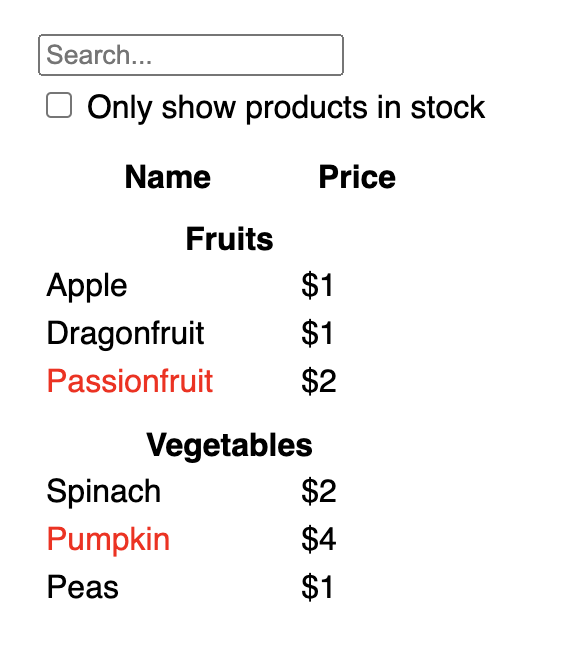 You want to make it so whenever the user changes the form inputs, the state updates to reflect those changes. The state is owned by FilterableProductTable, so only it can call setFilterText and setInStockOnly. To let SearchBar update the FilterableProductTable’s state, you need to pass these functions down to SearchBar: